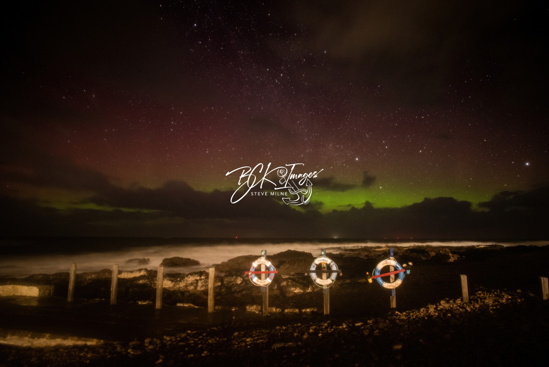 "Buckie Auroras" captures the mesmerisng Northern Lights illuminating the night skies above the historic fishing town of Buckie on Scotland's Moray Firth Coast. VIbrant greens , purples reds and blues dance over the harbours blending celestial beaauty with Buckie's rich history with the sea.